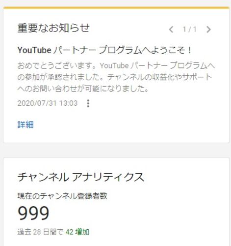 こんにちは、 というわけでまたまた速報記事です。 ・ ・ ・ 収益化審査通過しましたぁ~~ パチパチパチ(・ω・ノノ"☆ ちなみにキャプチャ画像の通り一度1000人達成した後また減って現在は999人ですが問題なく審査通過しましたし、その後の各動画の収益化設定も…